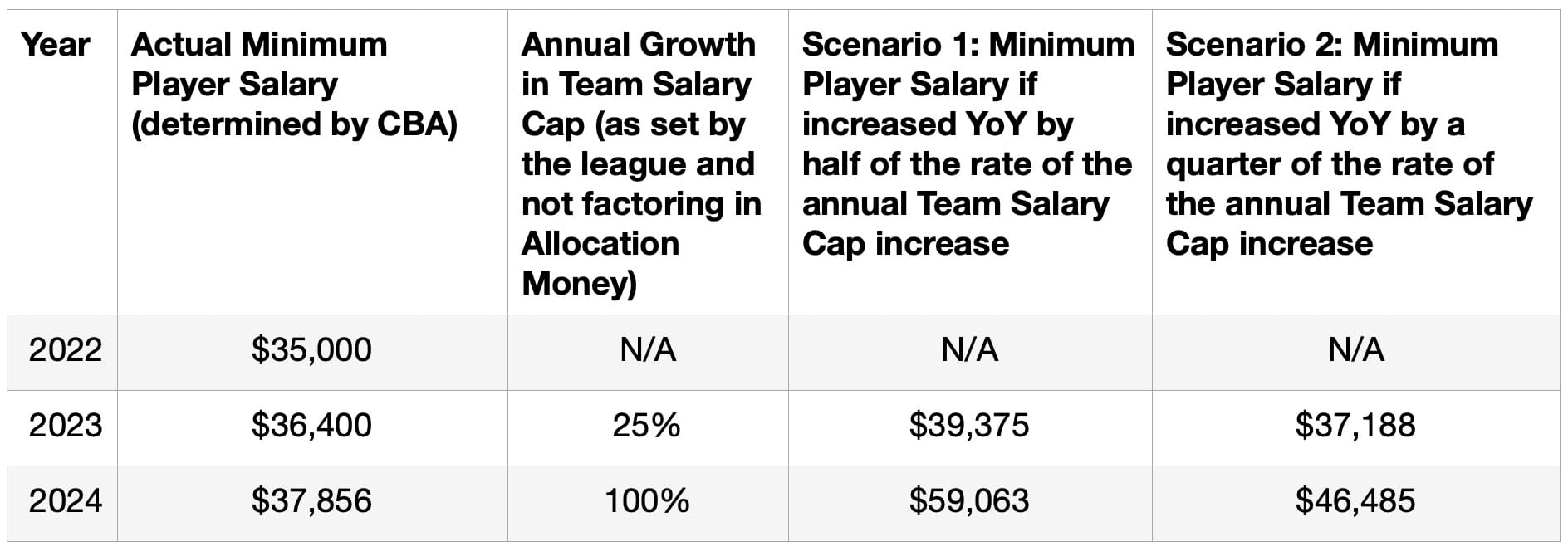 Yes, if you’re the Players, you would want to bake in some protection in case the Team Salary Cap growth is minimal in any given year - for example, the minimum player salary should increase year over year (YoY) by the greater of 4% or by a quarter of the rate of the annual Team Salary Cap increase.