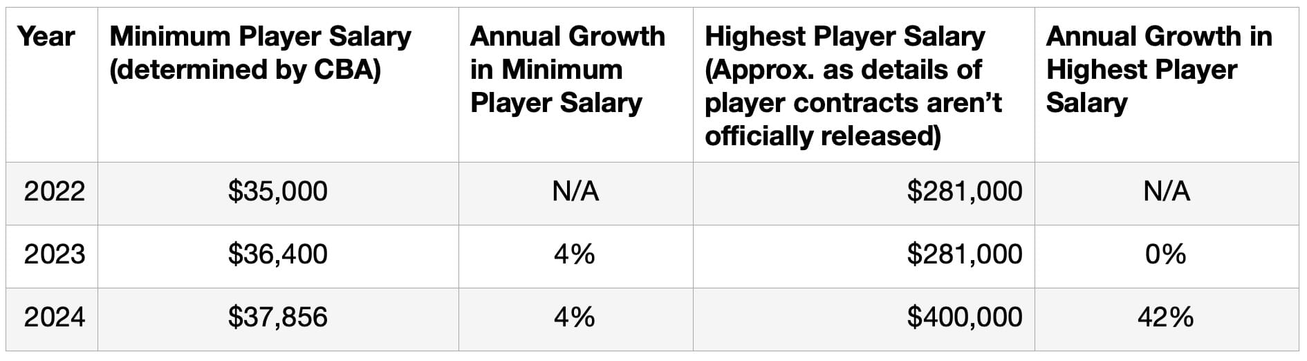 For example, the current CBA calls for a 4% increase in the league’s minimum salary for each year of the deal. Meanwhile, there is no negotiated maximum salary. Instead for each year of the CBA, the league in its sole discretion sets the team salary cap and the maximum individual player salary cap charge ($200k in 2023 with 2024’s number still to be announced), which can be exceeded in terms of actually paying the player a salary through the use of Allocation Money (until Allocation Money is retired at the conclusion of the 2026 season).