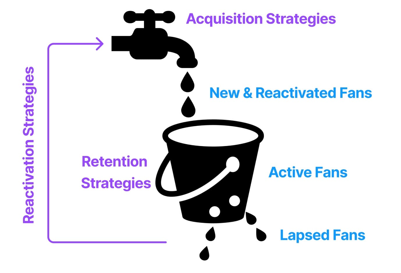 Let’s visualize this acquisition, retention, reactivation model with a leaky bucket metaphor, drill into these three activities a bit further and call out digital marketing capabilities the league doesn’t have today and needs to create to support these activities: