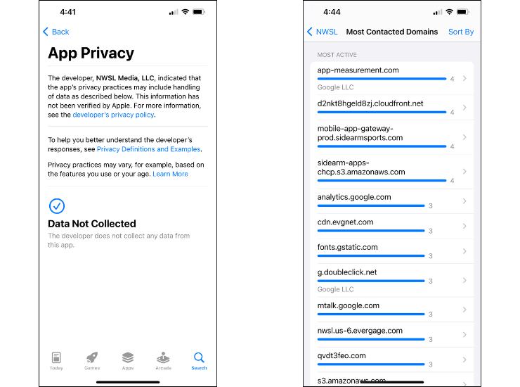 iOS’s App Network Activity report (Found by going to Settings —> Privacy & Security —> App Privacy Report —> App Network Activity: Show All —> NWSL) reports that the NWSL App is contacting domains such as: