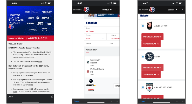 (To some degree, the league appears to acknowledge the the NWSL app is neglected. As part of the 2024 schedule announcement, the NWSL announced a new direct-to-consumer streaming service, NWSL+, which will have its own mobile experience, the NWSL+ app. What remains unknown at this point is whether the league will sunset its current NWSL app to focus on the upcoming NWSL+ app or whether the league will attempt to have both a NWSL and a NWSL+ app in the marketplace, which would create a massive mess from both branding and fan experience perspectives.)