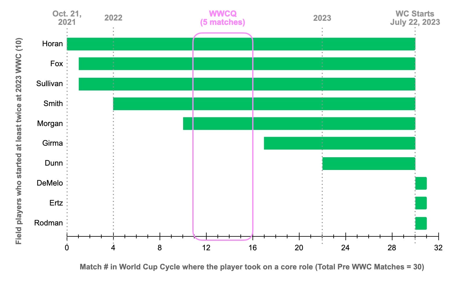 Here is how this graph looks for the 2023 team. The x-axis shows the number of matches during the build up to the World Cup. The green bars associated with each field player who started twice or more at the World Cup indicate the span of matches in the build up to the World Cup where the player regularly started.