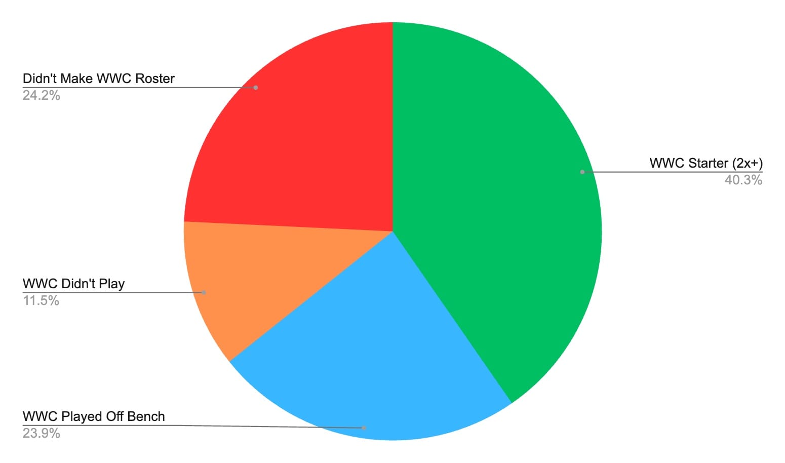 - Players who earned 2 or more starts in the World Cup only received 40.3% of the playing time prior to the 2023 FIFA Women’s World Cup, which was the lowest percentage by far. The 2003 team comes in second to last with 50.7% while every other squad had 63-70% of the available minutes in the build up to the World Cup go to the players who wound up starting at least twice at the tournament.