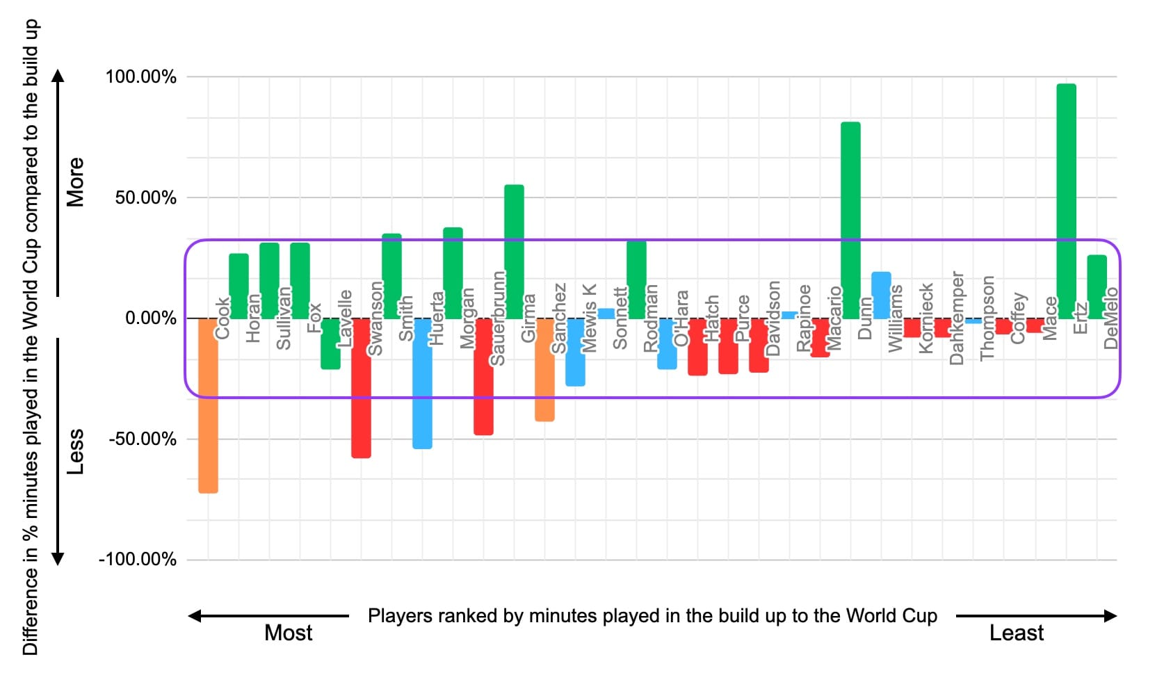 For the 2023 squad, notice how many individual field players saw a significant difference in their percent of available minutes played at the World Cup in comparison to the build up to the tournament, which is reflected by the bars that eclipse the purple rectangular box. There are 10 players who eclipsed this mark with 8 of these players surpassing the +/- 33% mark by five percentage points or more.