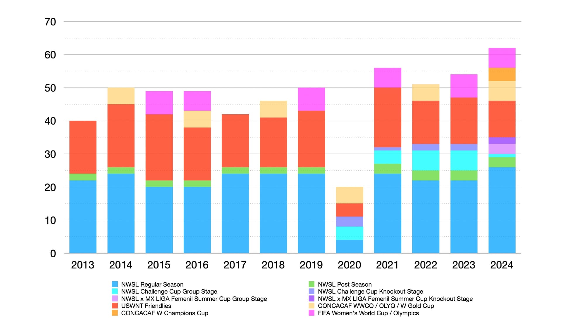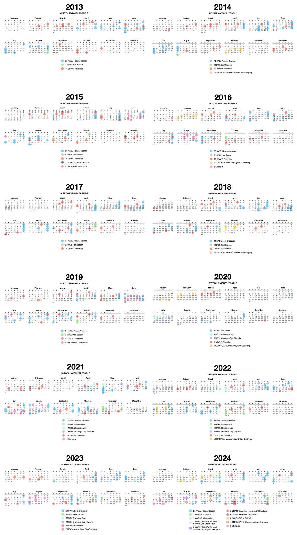 Let’s look at this through the lens of the majority of American female professional soccer players - the players who play professionally in the NWSL and who also play for the U.S. Women’s National Team. Let’s start by simply considering how the maximum number of possible matches for these players has increased since the NWSL’s inception in 2013.