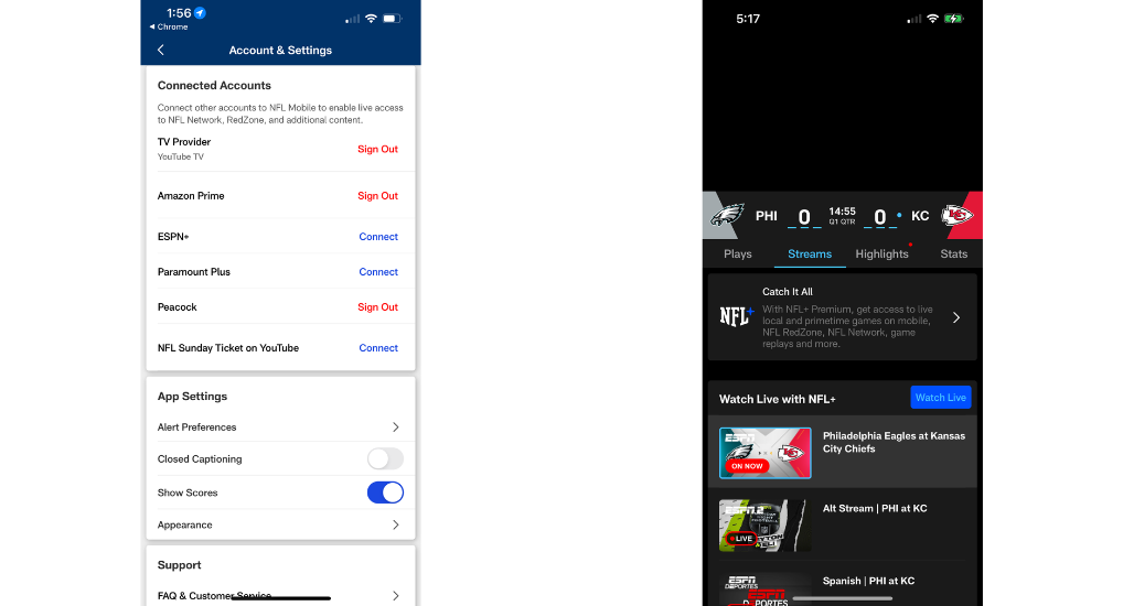 How does the NFL make it easy for fans to watch their games? Just connect your TV provider and streaming accounts in the NFL App or NFL.com's settings and simply open the NFL app or go to NFL.com to watch any game you’ve got a subscription for. Once you have connected your accounts, there is no linking out to another platform. The game plays right in the NFL App or on NFL.com.