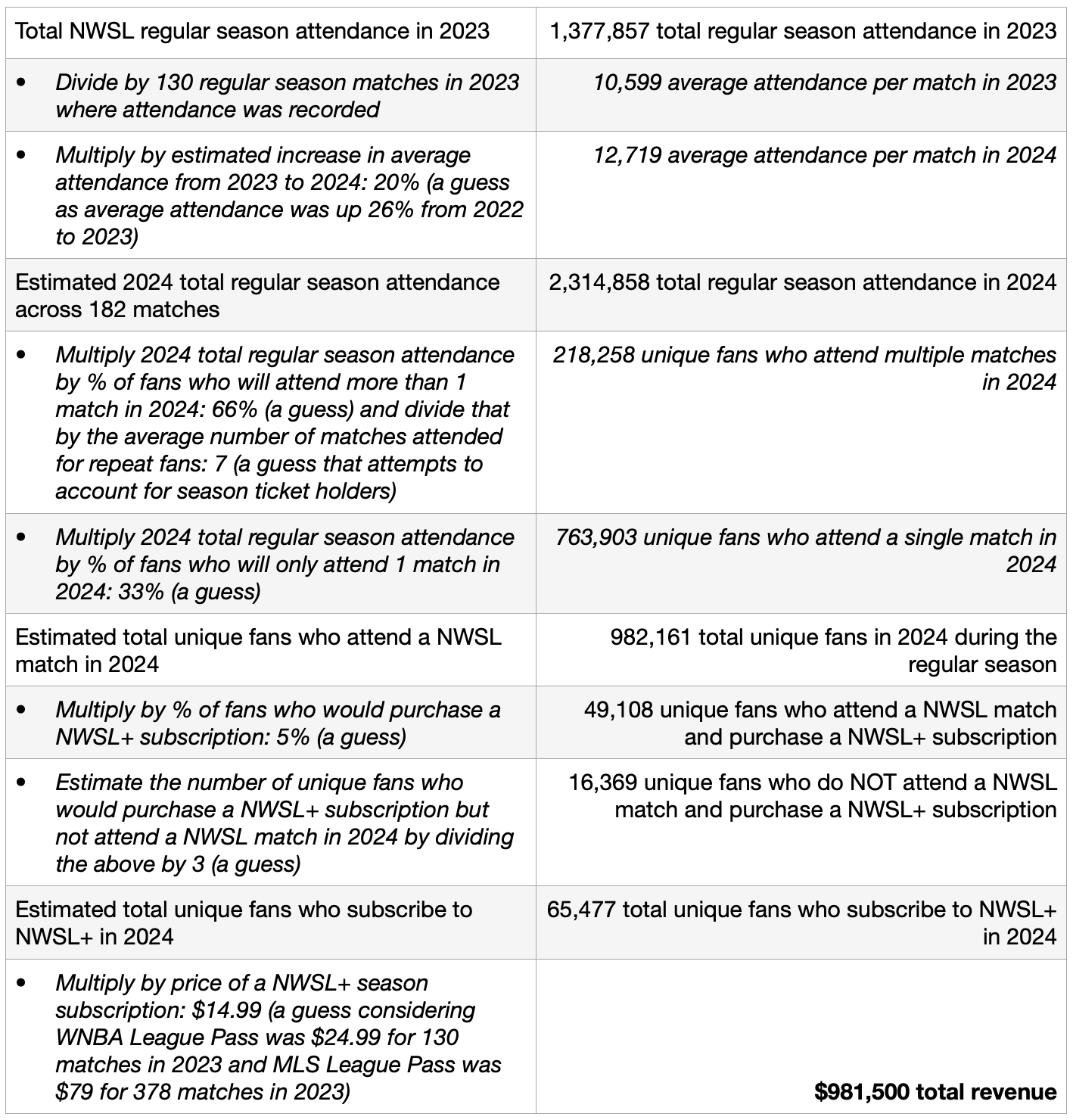 Obviously there is some guess work and assumptions here - i.e. I’m assuming that every NWSL+ subscriber pays full price. But I think the NWSL is leaving approximately a million dollars on the table by not charging a fee to subscribe to NWSL+ in 2024.